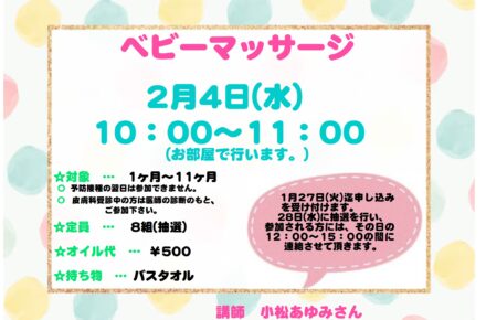 子育て支援センターどんぐり『リンパデトックスヨガ』参加募集のお知らせ 2025.09.24お知らせ 参加希望の方は、【行事参加フォーム】よりお申し込みください。 お知らせ 子育て支援センターどんぐり『10・11・12月のおたより』で... 10月の子ども地域食堂 ななかま堂のお知らせです。 関連記事一覧 子育て支援センターどんぐり『節分 豆まき』参加募集のお知... 子育て支援センターどんぐり『スプリングタペストリーをつく... 8月の子ども・地域食堂 ななかま堂のお知らせ 子育て支援センターどんぐり『ネイルチップをつくろう!』参... 園内の感染状況 3月18日現在 ③ コロナ感染症のお知らせ 子育て支援センターどんぐり『ベビーマッサージ』参加募集の... 子育て支援センターどんぐり『10・11・12月のおたより... 子育て支援センターどんぐり『ミニチュアこいのぼりを作ろう...