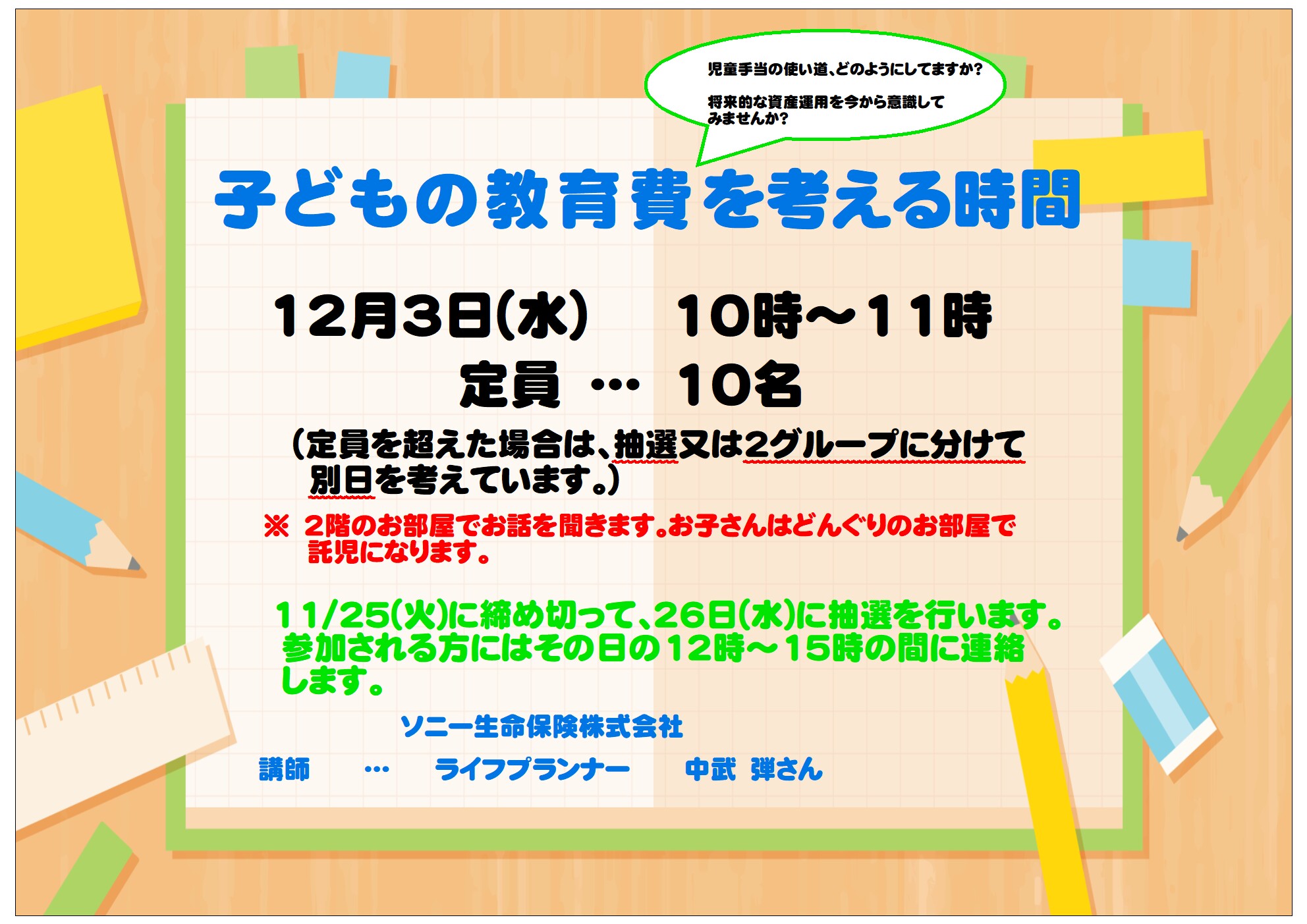 子育て支援センターどんぐり『子どもの教育費を考える時間』参加募集のお知らせ 2025.11.08お知らせ 参加希望の方は、【行事参加フォーム】よりお申し込みください。 お知らせ 11月の子ども・地域食堂 ななかま堂のお知らせ。 関連記事一覧 子育て支援センターどんぐり『私のワンピースの着せ替えセッ... 子育て支援センターどんぐり『うちわ作り』参加募集のお知ら... 8月 子ども・地域食堂 ななかま堂のお知らせ 子育て支援センターどんぐり『プラ板で名札を作ろう!』参加... 8月の子ども・地域食堂 ななかま堂のお知らせ コロナ感染症のお知らせ 子育て支援センターどんぐり『クリスマス会』参加募集のお知... 子育て支援センターどんぐり『魚つりセットを作ろう!』参加... 園内の感染状況 3月18日現在 ③
