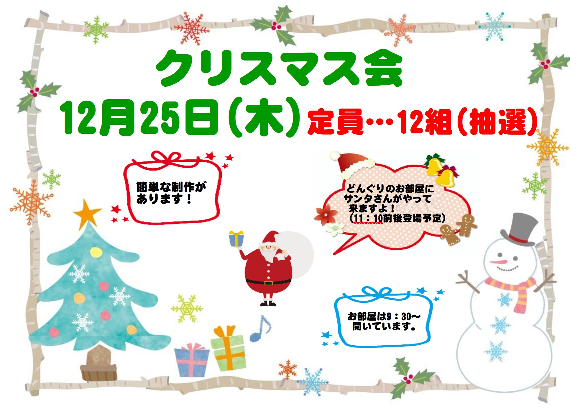 子育て支援センターどんぐり『クリスマス会』参加募集のお知らせ 2025.11.28お知らせ 参加希望の方は、【行事参加フォーム】よりお申し込みください。 お知らせ 子育て支援センターどんぐり『子どもの教育費を考える時間』参加... 関連記事一覧 11月 子ども・地域食堂 ななかま堂のお知らせ 子育て支援センターどんぐり『7・8・9月のおたより』です... 子育て支援センターどんぐり『7・8・9月のおたより』 子育て支援センターどんぐり『1・2・3月のおたよりです!... 6月の子ども地域食堂 ななかま堂のお知らせ! 子育て支援センターどんぐり『ネイルチップをつくろう!』参... 子育て支援センターどんぐり『ヨガ体験』参加募集のお知らせ 子育て支援センターどんぐり『0ちゃんあつまれ!』参加募集... 子育て支援センターどんぐり『セルフケア講座』参加募集のお...