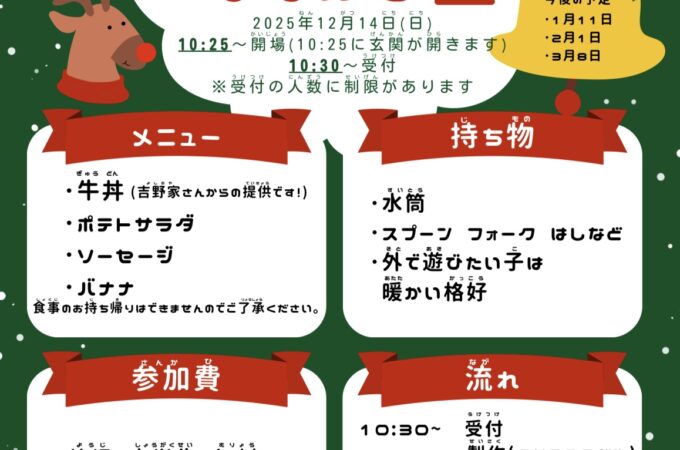 12月 子ども・地域食堂 ななかま堂のお知らせ みなさん こんにちは! 12月の子ども・地域食堂 ななかま堂のお知らせです。 日時 12月14日(日) 10:30~ 場所 あすか... 2025.12.06未分類