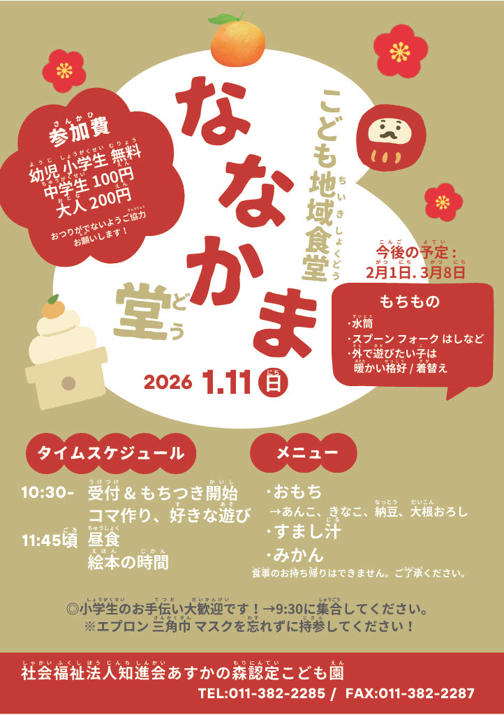 みなさま あけましておめでとうございます。 令和8年度 最初の子ども地域食堂 ななかま堂のお知らせです。