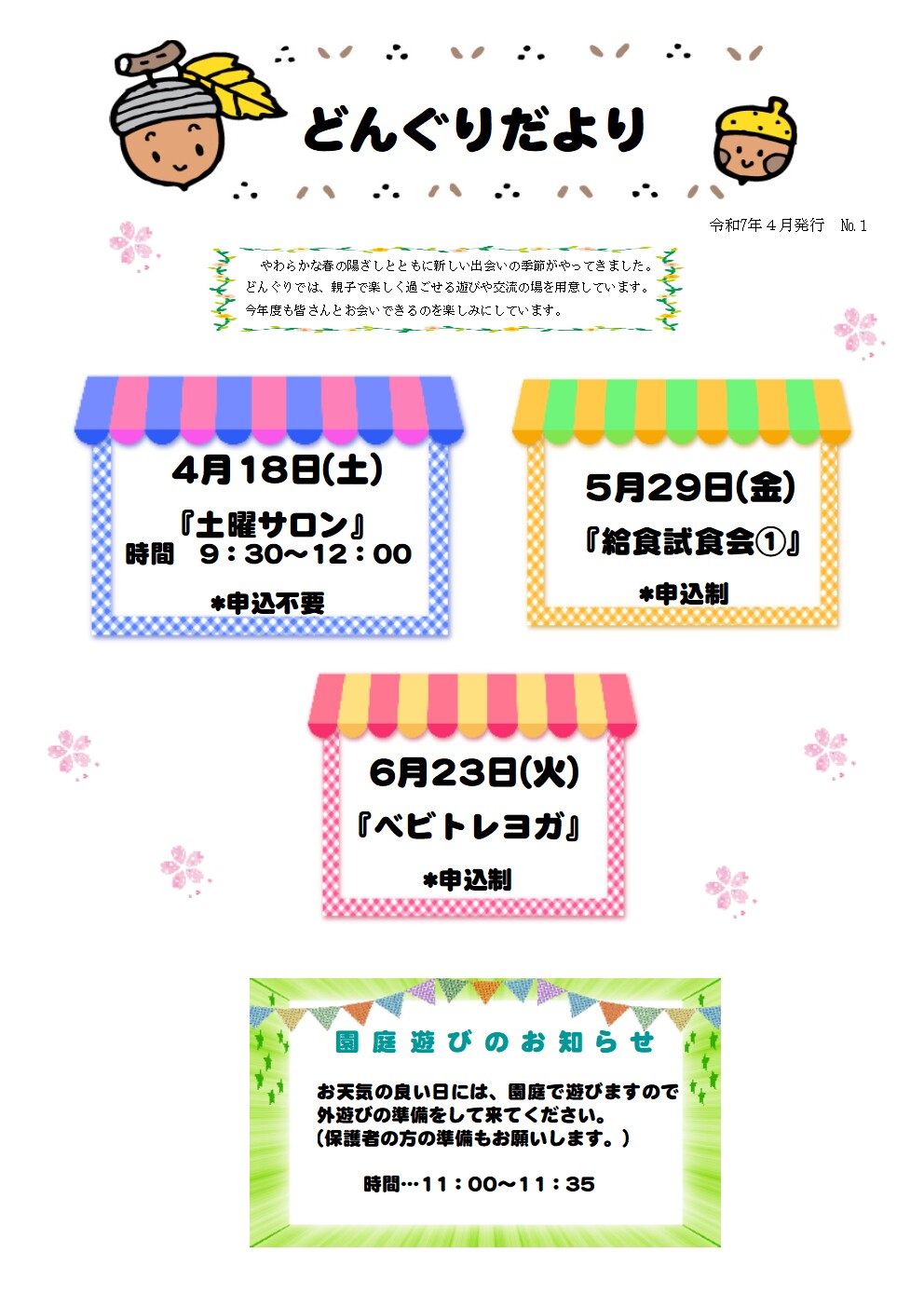 子育て支援センター『4・5・6月のおたより』です! 2026.03.24お知らせ, 未分類 お知らせ, 未分類 3月の子ども・地域食堂 ななかま堂のお知らせです。 関連記事一覧 子育て支援センターどんぐり『4・5・6月のおたより』です... 子育て支援センターどんぐり『ベビーマッサージ』参加募集の... 11月 子ども・地域食堂 ななかま堂のお知らせ 3月のこども地域食堂 ななかま堂のお知らせです。 子育て支援センターどんぐり『パンチニードル体験』参加募集... 子育て支援センターどんぐり『2階のホールであそぼう!』の... 8月のこども・地域食堂 ななかま堂のご案内 子育て支援センターどんぐり『プラ板で名札を作ろう!』参加... 子育て支援センターどんぐり『10・11・12月のおたより...